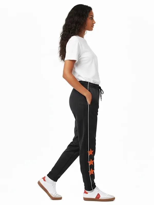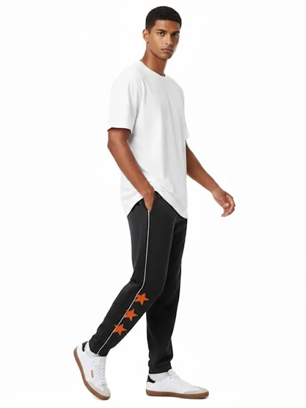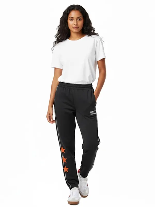 Elevate your casual style with these Marty Supreme A24 Black Track Trouser. Featuring a sleek black base with vintage-inspired white piping, these joggers showcase three iconic orange stars and official film branding. Designed with an elasticated waistband and cuffed ankles, they offer ultimate comfort and a modern, athletic silhouette.