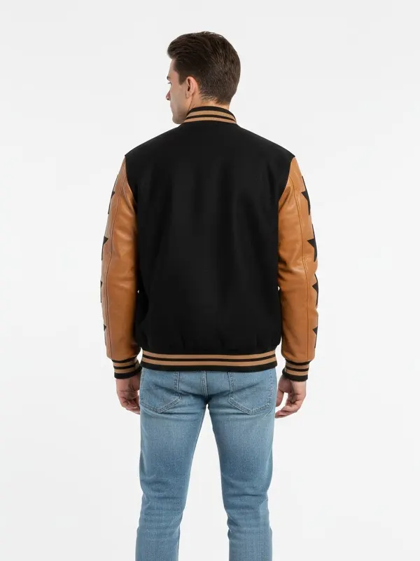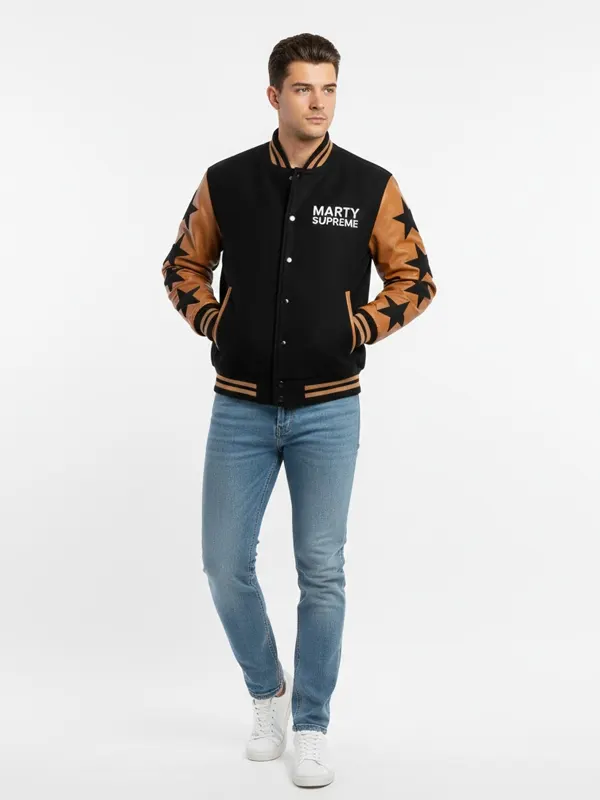 This Marty Supreme Varsity Jacket combines rugged charm with a classic collegiate silhouette. It features a high-quality black wool body paired with tan brown leather sleeves, detailed with black star patches. Finished with a comfortable viscose lining and striped ribbing on the collar and cuffs, this jacket is the perfect statement piece for any modern wardrobe.