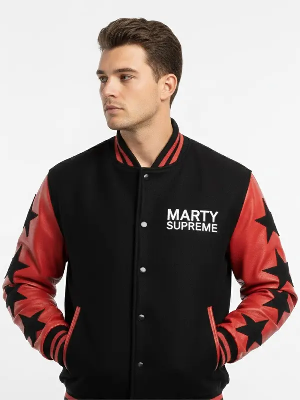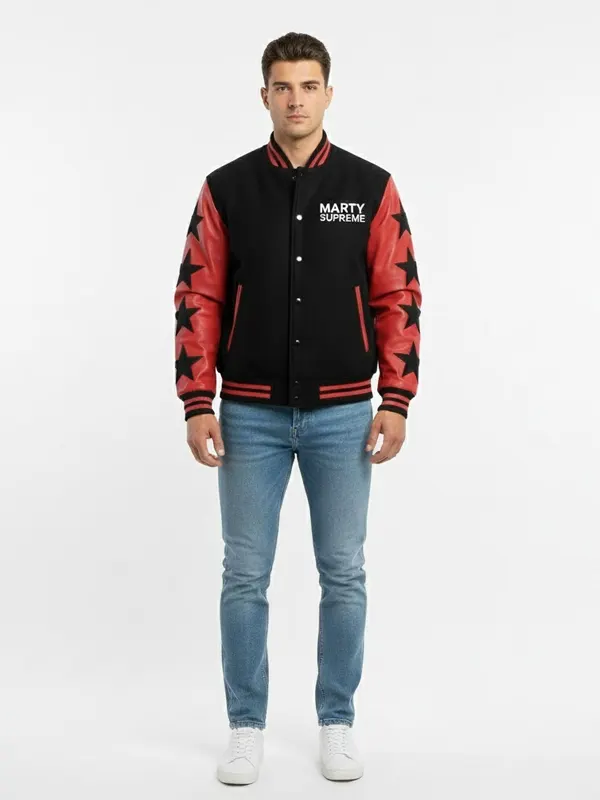 This Marty Supreme Varsity Jacket defines high-energy urban style. Combining a premium black wool body with vibrant red leather sleeves adorned with black star patches, it offers a bold visual contrast. The iconic logo on the chest and striped ribbing provide a classic collegiate feel. Designed for durability and comfort, this jacket is the ultimate statement piece.