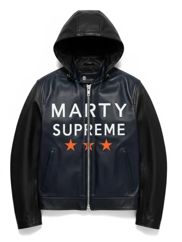 Timothée Chalamet shines as Marty Mauser in the spirited sports comedy drama Marty Supreme, where ambition meets style on and off screen with laughter and heart. This navy hooded leather jacket made from premium quality faux leather feels soft yet rugged, giving warmth and edgy streetwear appeal, perfect for casual days out and fan-inspired wear.