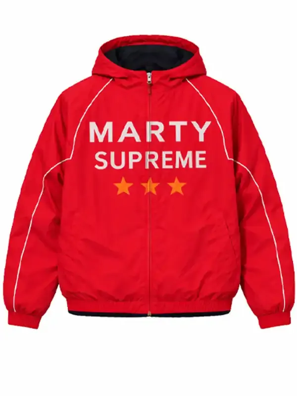 The Marty Supreme Red Jacket is crafted from a cotton-polyester blend with a soft viscose lining for comfort. It features full-length sleeves, a zipper closure, elastic cuffs, and a hooded collar. Designed with two outer pockets and one inner pocket, this red jacket is ideal for casual wear, travel, outdoor activities, street style, and everyday use. Its lightweight feel, modern design, youthful vibe, and versatile seasonal appeal make it a perfect wardrobe choice.
