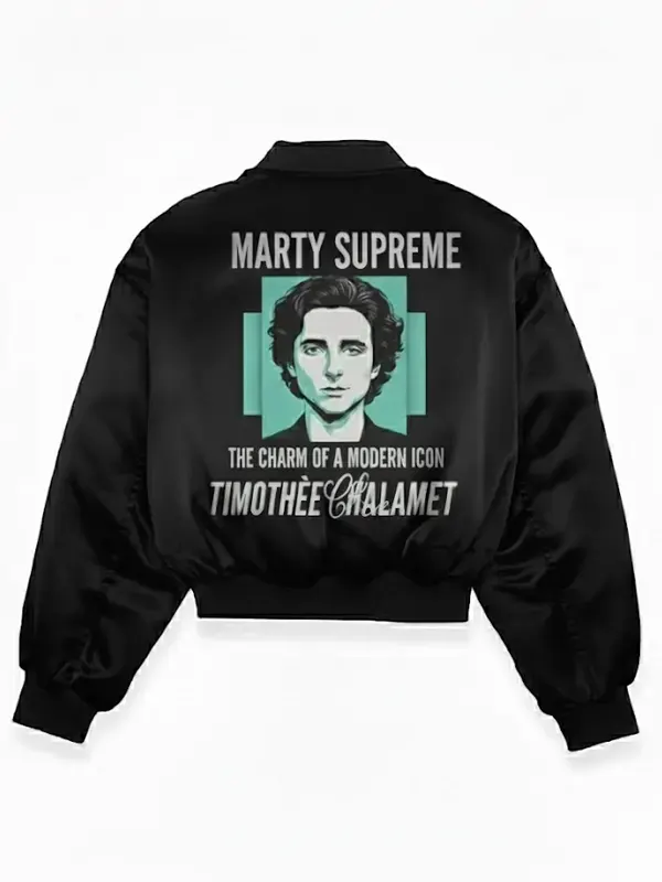 Marty Supreme showcases Timothée Chalamet as an unforgettable ping pong legend chasing dreams through dramatic highs and wild adventures on screen. This black bomber jacket brings sleek, crisp material with smooth lining that enhances warmth and style, making it ideal for urban outings, street looks, and bold everyday wear for fans craving standout, effortless fashion.