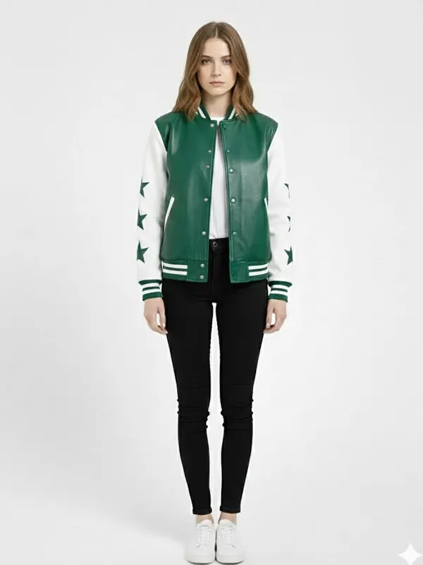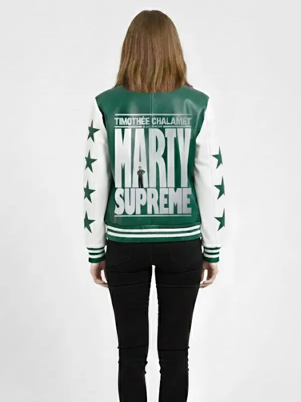 This Marty Supreme Varsity Jacket brings a vibrant, fresh look to a classic athletic silhouette. Crafted with a premium green leather body and contrasting white leather sleeves adorned with green star patches, it offers a high-impact style. The soft inner lining and signature striped ribbing ensure a comfortable fit, making it a standout choice for streetwear enthusiasts.