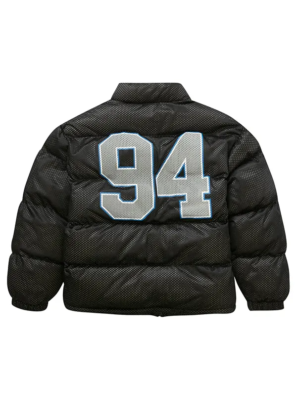 Redefine your winter aesthetic with the Supreme Mesh Jersey Black Puffer Jacket. This unique piece features a breathable mesh outer layer over heavy padding for a textured, athletic look. Highlighted by a large ’94 graphic on the back and arched Supreme branding on the chest, it combines vintage jersey vibes with the warmth of a classic puffer.