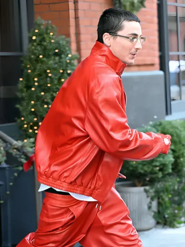 Make a powerful statement with the Timothée Chalamet Marty Supreme Red Leather Jacket. Seen on the set of the 2025 film, this jacket is crafted from premium faux leather for a luxurious feel. Featuring a minimalist design with a stand-up collar and elasticated hem, it offers a sharp, modern silhouette that works for any occasion.